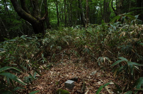 山頂手前100mは猛烈な笹だったが、そこまでは薄い作業道があった。三角点は、古い