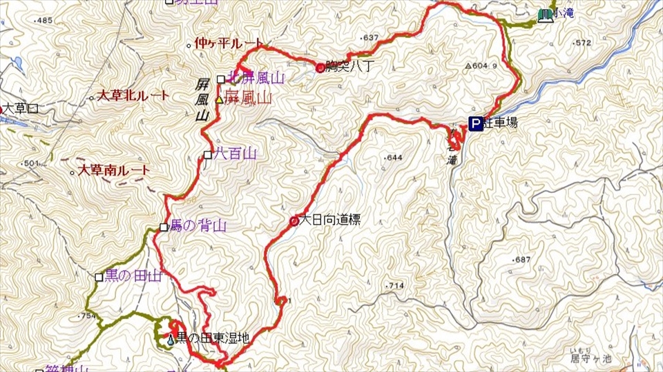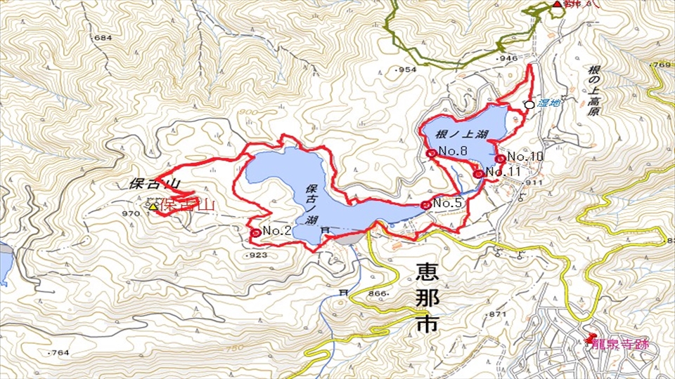 道の駅らっせいみさとに駐車し、上平という三角点に向かう。 偶然ウオーキングコースに入った様で『緑の散策路』と書かれた道標がある。民家の私道に入らないか心配した が、これなら気兼ね無く歩ける。まずは目星を付けた沢に寄り道し様子を見に行くと、古い水路跡があって助かった。 沢の右岸の尾根を登り始めると、かつての馬搬道なのか荒れているものの、しっかりした道でやがて石組みの 古いがきれいな橋に出合った。こんな場所にはもったいない感じだが、何か理由があるのだろう。 このまま植林の尾根を辿っても良かったが、橋を渡ってから最初の尾根方向に戻った。 こちらの尾根の方が直接上平に向かえ、何よりこちらは自然林。 やがてシンボリックな大岩が表れ、登りきるとまだ形をとどめる祠の跡があった。下の武並神社の奥宮なのか 分からないが、御霊抜きされ今は下に降ろされているのかもしれない。 ここから少し登ると林道を横切り、ショートカット…すると、その先の右の高みで上平の三角点に着いた。 いくつかの薄黄色のフィルムテープの目印があった。 林道を少し歩き、適当に東海自然歩道の、お茶屋場跡に向け適当に下った。藪は無いのでルートどりは 自由自在。野井取手平を見に行ったが、あとからネットを見るともう50m下だったようである。 ただ600m付近にも曲輪や不自然な石垣らしき跡があったので、ここだと思ったのであるが?…研究者で無く 資料も無いので。ここには鉄塔112への道があり、アプローチに問題無し。 お茶屋場跡に戻って東海自然歩道を下り、途中から法仙寺4等三角点に向かう。遺跡の法仙寺の名称 が点名に付いている。ここも鉄塔111があるので道はある。ただ三角点は茂みで目立たない。 鉄塔111から東海自然歩道へ地図の点線の谷道で降り、小ヶ沢溜池の堤防を通って野井白金城と旗平を見学。 白金城にはプレートと標柱がある。展望がほしいですが、立木で展望無し。適当な下りで、民家の側の竹藪から アスファルト道路に下り、駐車位置に向かった。