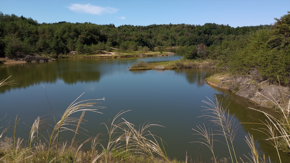 寿老滝駐車場から屏風山…馬の背山からは、いつものコースを変え、ススキの立つ廃道気味の上部林道経由で黒の田湿地に寄ってから戻った。湿地の花はウメバチソウが終盤で、イワショウブ、サワシロギク、サワギキョウやミミカキグサの花の残りをまだ見る事が出来た。シラタマホシクサをバックに何匹かのアキアカネが、木道の手すりにとまっていた。